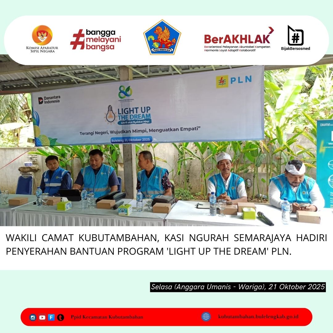 Depeha, 21 Oktober 2025 – PT PLN (Persero) UP3 Bali Utara merayakan Hari Listrik Nasional ke-80 dengan menyerahkan bantuan pemasangan listrik gratis melalui program Light Up The Dream (Listrik untuk Nyalakan Mimpi). Kegiatan penyaluran bantuan ini dipusatkan di Desa Depeha, Kecamatan Kubutambahan, yang secara simbolis diberikan kepada salah satu penerima, Putu Monday Aras Rantawan.
