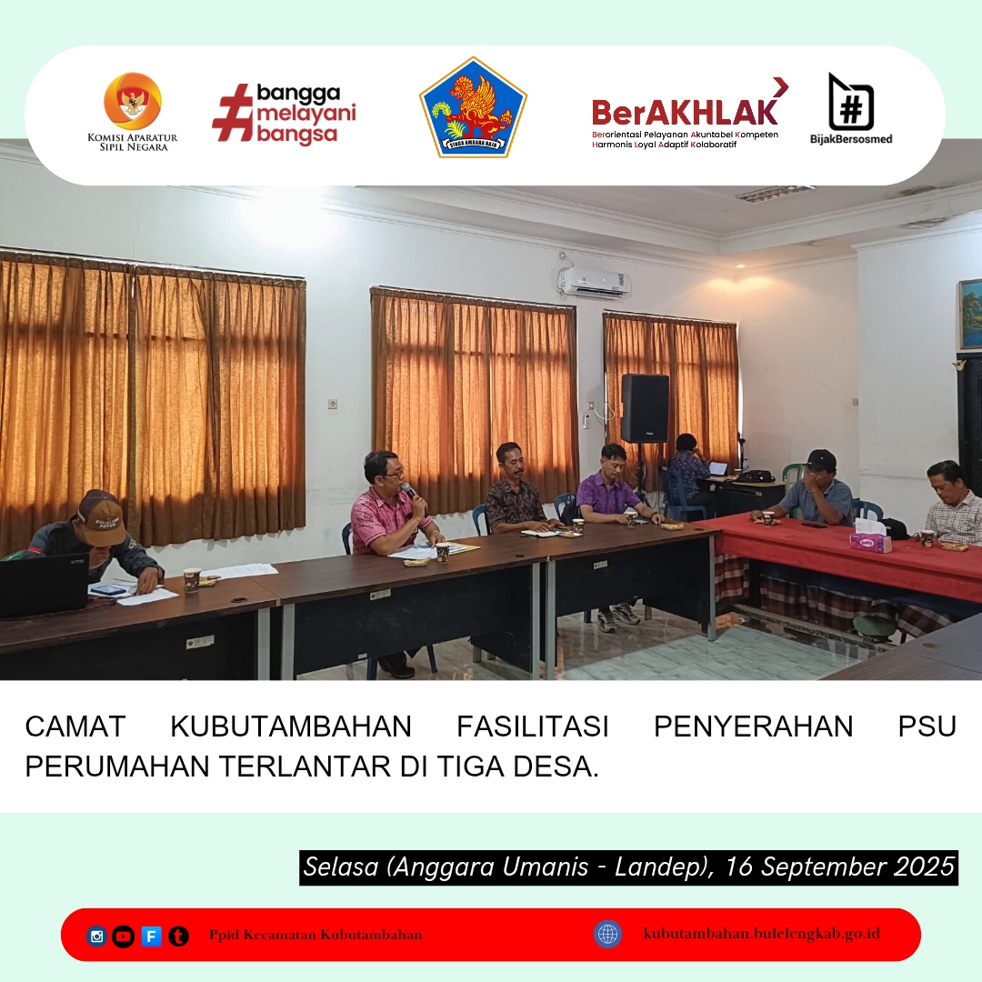 KUBUTAMBAHAN - Kecamatan Kubutambahan memfasilitasi kegiatan Dinas Perumahan, Kawasan Permukiman, dan Pertanahan (Perkimta) Kabupaten Buleleng dalam menyosialisasikan dan mengoordinasikan penyerahan Prasarana, Sarana, dan Utilitas (PSU) perumahan terlantar. Kegiatan ini berlangsung pada Selasa, 16 September 2025, di Ruang Rapat Kantor Camat Kubutambahan.