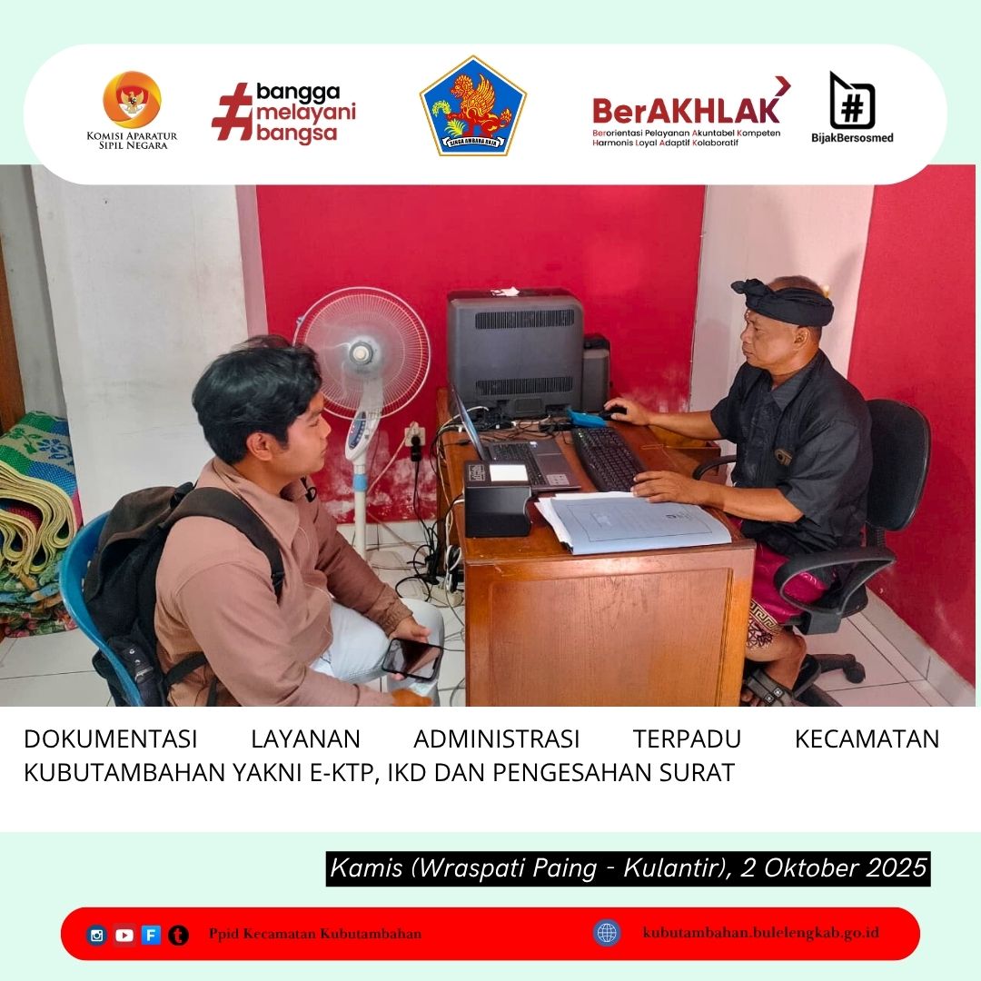 Dokumentasi Layanan Administrasi Terpadu Kecamatan Kubutambahan yakni e-KTP, IKD dan Pengesahan Surat di Ruang Pelayanan Terpadu Kantor Camat Kubutambahan. Kamis, 2 Oktober 2025