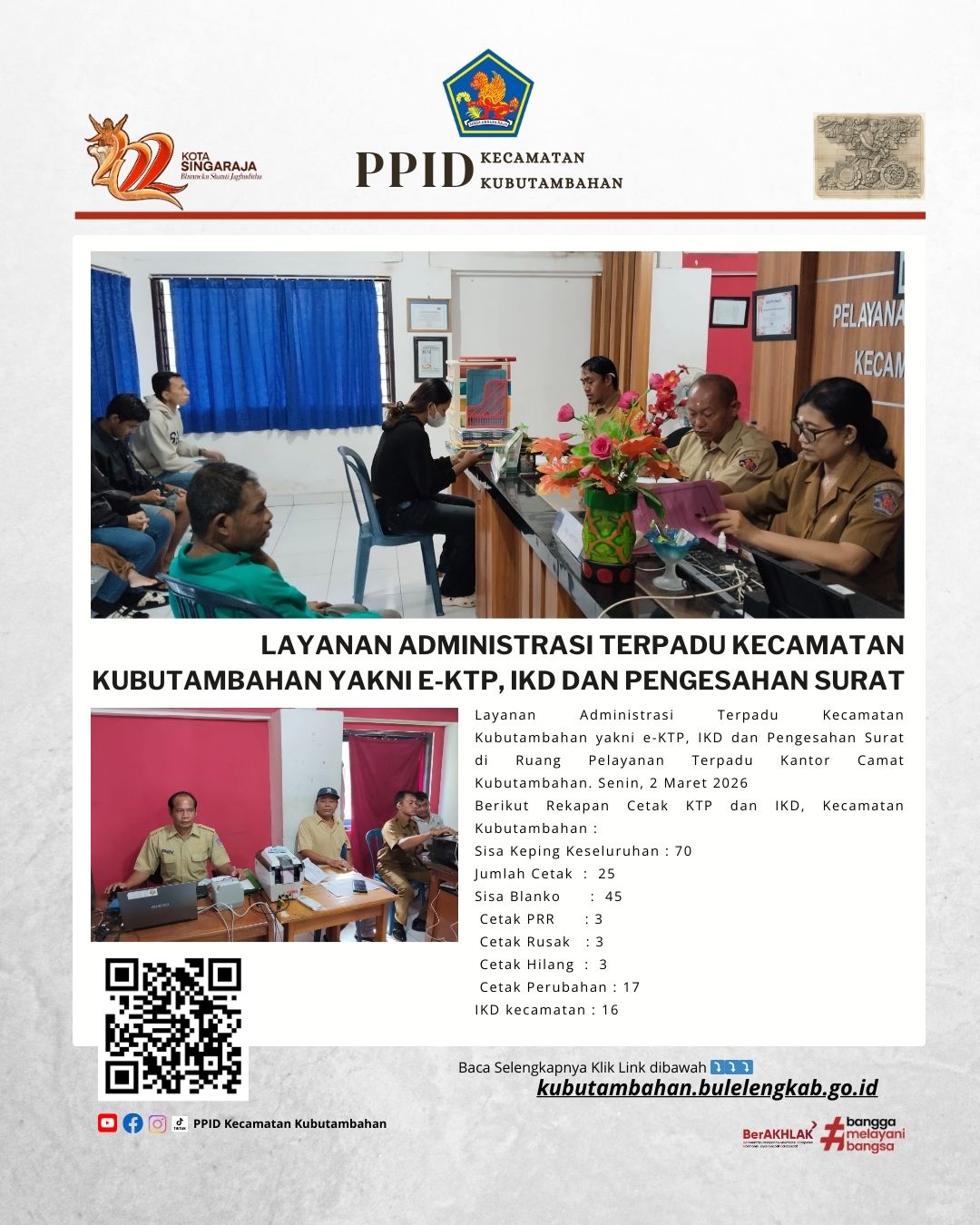 Layanan Administrasi Terpadu Kecamatan Kubutambahan yakni e-KTP, IKD dan Pengesahan Surat di Ruang Pelayanan Terpadu Kantor Camat Kubutambahan. Senin, 2 Maret 2026