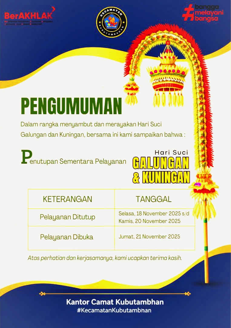 Dalam rangka menyambut dan merayakan Hari Suci Galungan dan Kuningan, bersama ini diumumkan bahwa: